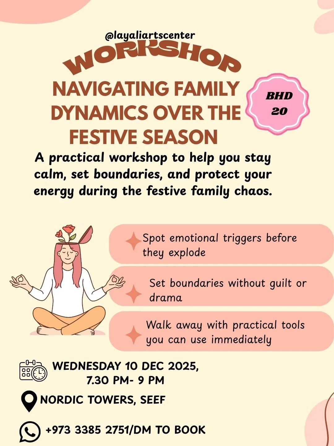 At Layali Arts Center in Seef, Bahrain, our community workshops are designed for adults and families who want to connect, learn, and grow. These sessions go beyond classes, offering support, creativity, and inspiration in a welcoming community environment.